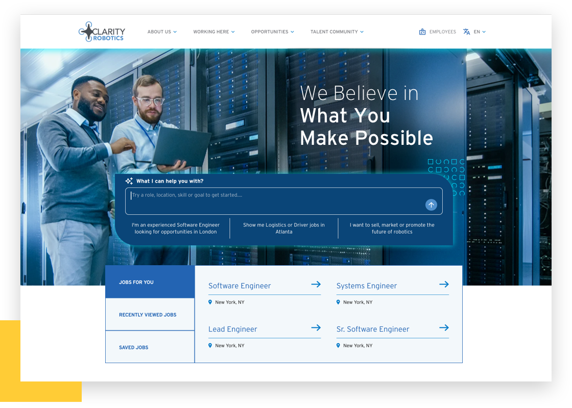 Accelerate results by giving employees direct access to relevant job opportunities within the organization. Radancy’s Internal Mobility Career Site delivers tailored content, hyper-targeted messaging and internal terminology that aligns with your company culture, making the job search process engaging and intuitive.