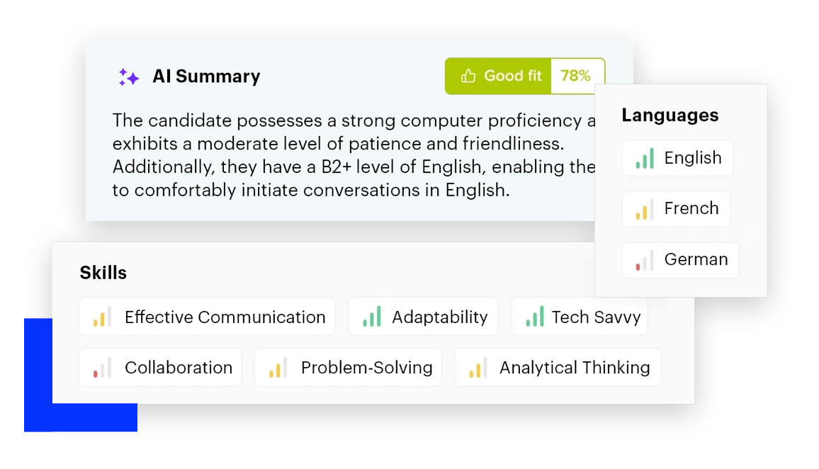 Automatically assess candidate responses, highlight top matches and skip the back-and-forth. From professional to high-volume positions, you’ll get faster shortlists, clearer insights and smarter decisions – all in one seamless flow.