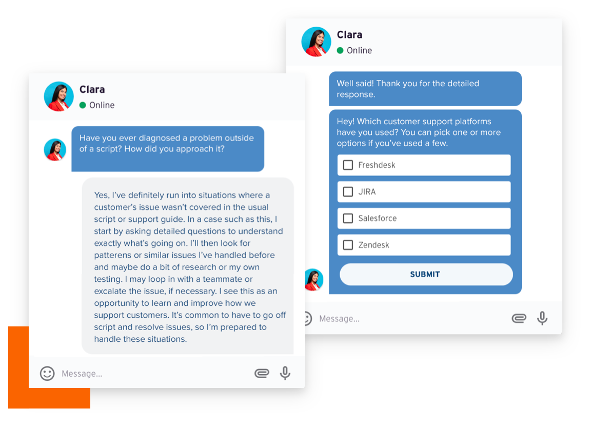 - Responda às dúvidas dos candidatos com IA orientada que mantém a conversa no foco.